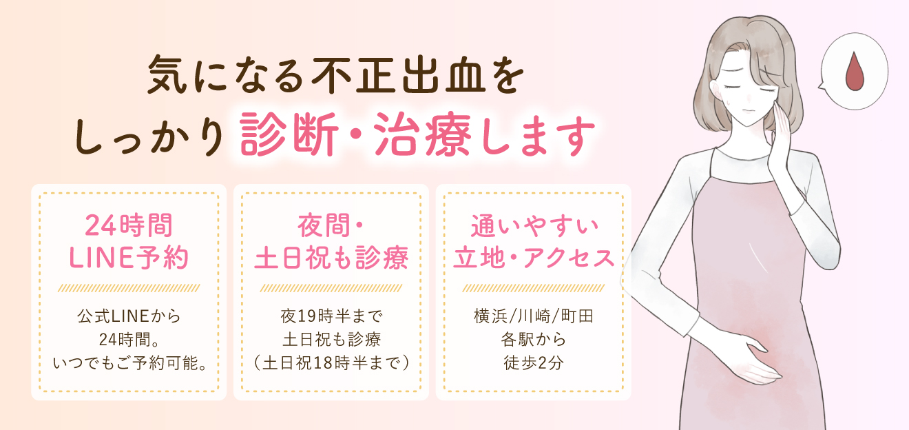 公式LINEまたはお電話でご予約ください。WEB問診で、いつから出血があるか、量や色、他の症状などを事前にご入力いただくと診察がスムーズです。