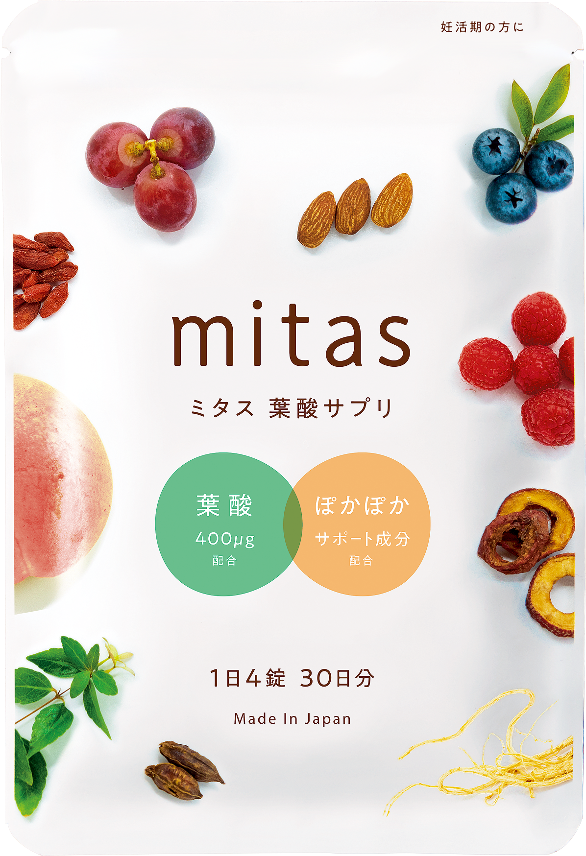 mitas(ミタス)は、妊活中の女性に特化して設計された葉酸サプリ。妊活専門の産婦人科医が監修し、厚生労働省が推奨するモノグルタミン酸型葉酸を400μg配合しています。