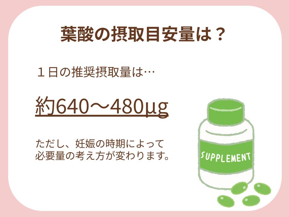 | 妊娠前~妊娠初期 | 640μg | 400μg/日はサプリからの摂取を推奨 |