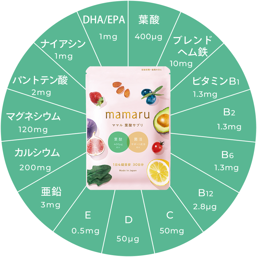 mamaru(ママル)は産婦人科医監修のもと、妊婦期の栄養補給に特化して作られた葉酸サプリ。モノグルタミン酸型葉酸400μgを配合し、妊娠初期に推奨される摂取量をしっかりカバーできるオールインワンサプリです。