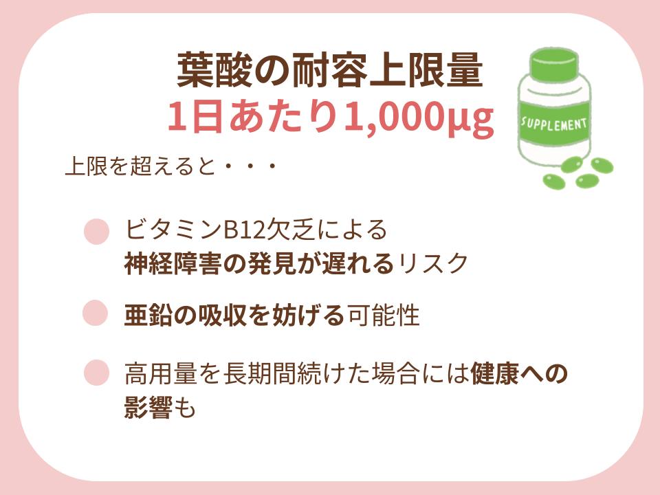 葉酸は「多ければ多いほど良い」というものではなく、過剰摂取による健康リスクを防ぐため、厚生労働省によって「耐容上限量」が定められています。