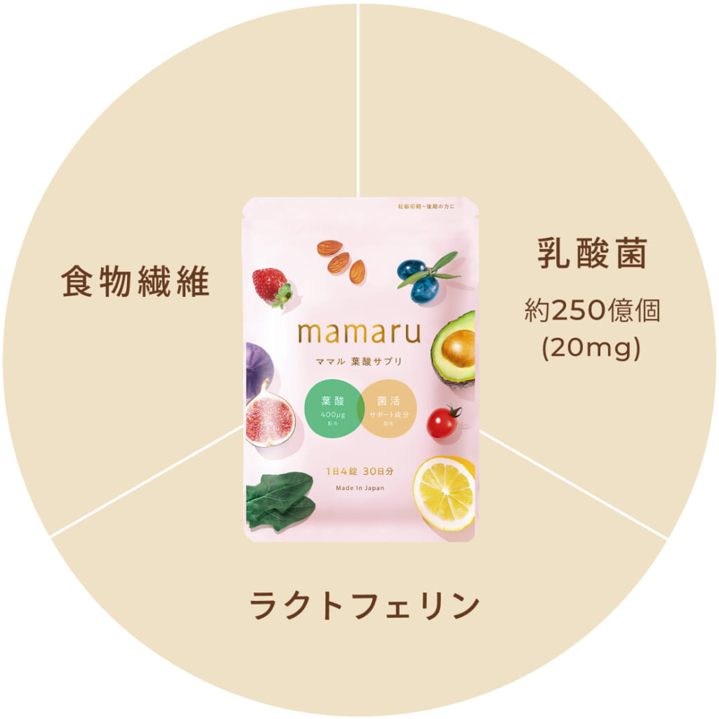 mamaruには乳酸菌や食物繊維、ラクトフェリンが配合されており、ママの元気までトータル的にサポートします。