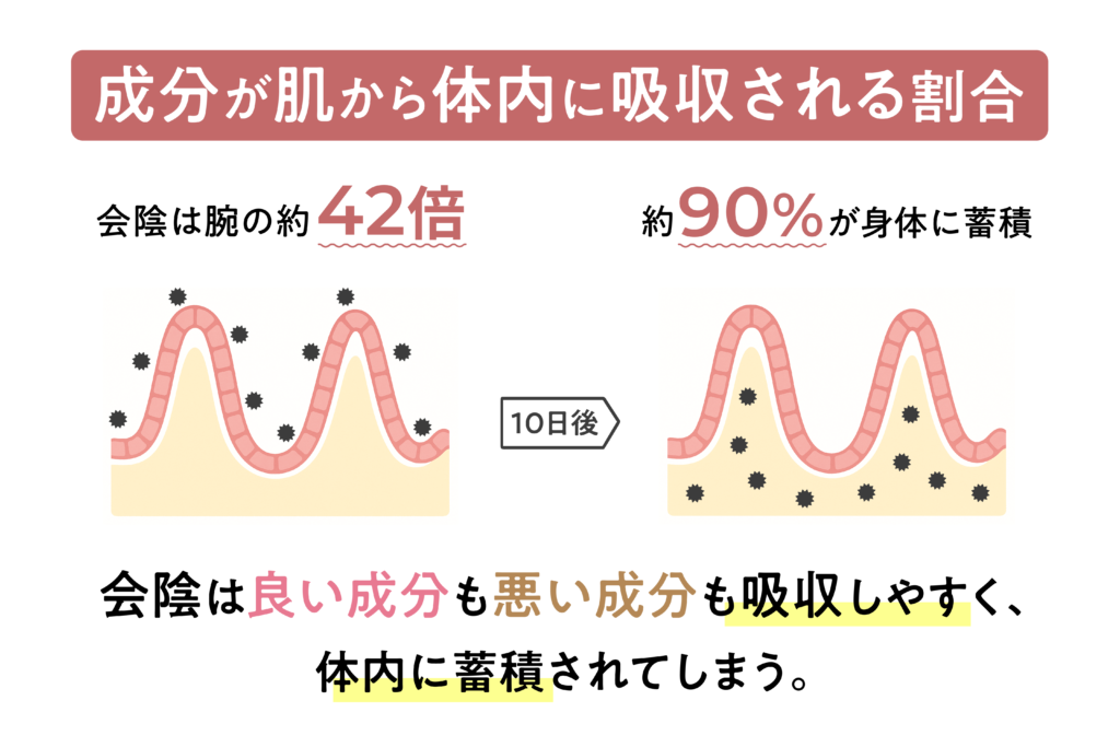 実は、性器(会陰)から体内への成分吸収率は腕の内側の約40倍とも言われるほど高く、肌に触れる成分はそのまま体の中へ取り込まれていきます。さらに、吸収された成分の約90%が10日後も体内に蓄積するとされており、だからこそ、使用するオイルの質がとても大切です。