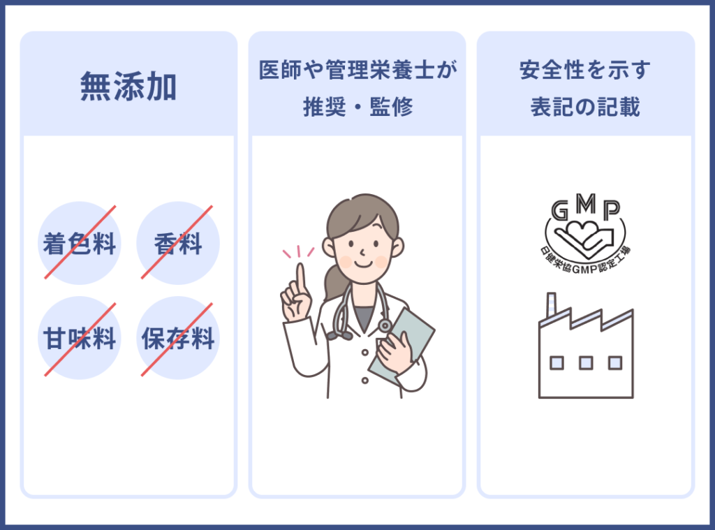 安全性 | GMP認定工場で製造/香料・着色料など14種の無添加/管理栄養士監修 |