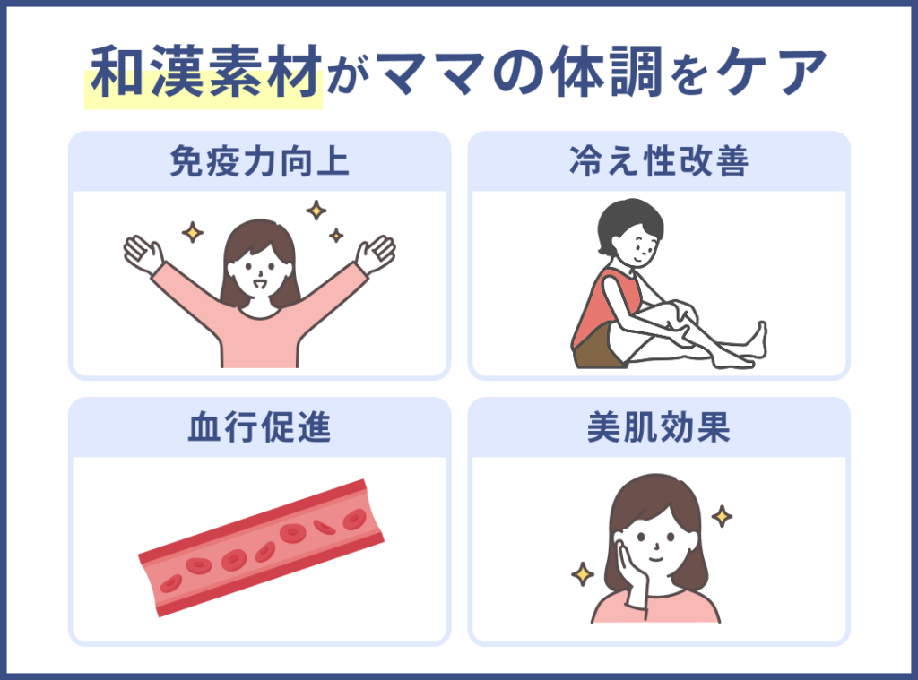 和漢素材には高麗人参や生姜などが挙げられます。これらの成分には、体の内側からイキイキをサポートする効果や体を温めて結構を良くする効果などが期待できます。睡眠不足やホルモンバランスの乱れ、体のだるさといった産後の疲労に寄り添うことで、赤ちゃんに必要な栄養を届けやすい母乳づくりをケアできます。