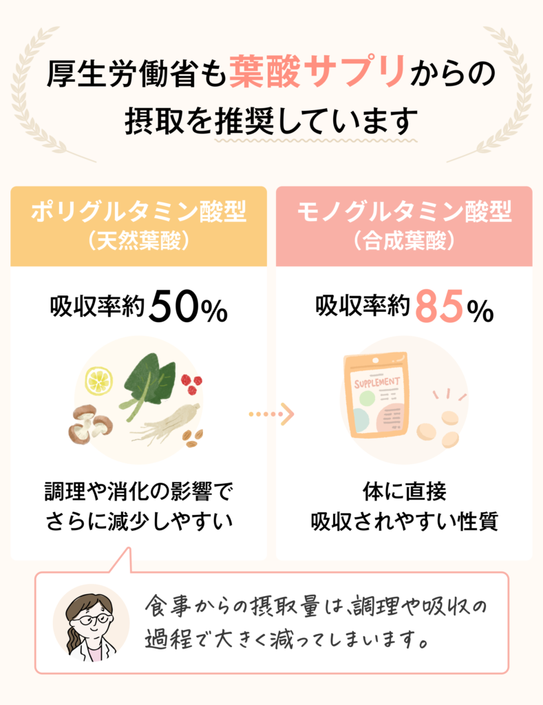 また、葉酸は量だけでなく種類も重要です。食事に含まれる天然の葉酸(ポリグルタミン酸型)は吸収率が約50%と低いため、「モノグルタミン酸型葉酸」配合のサプリを選ぶのがおすすめ。この型は体に吸収されやすく、吸収率は約85%と高い水準を誇ります。
