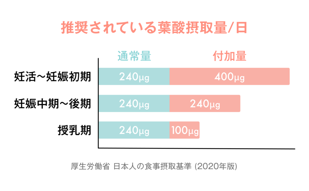 厚生労働省では、妊娠を望む女性や妊娠初期の方に対し、食事からの摂取に加えて1日400µgをサプリから補うよう推奨しています。必要な量を過不足なく摂るためには、400μgの葉酸が含まれた妊活サプリを選びましょう。