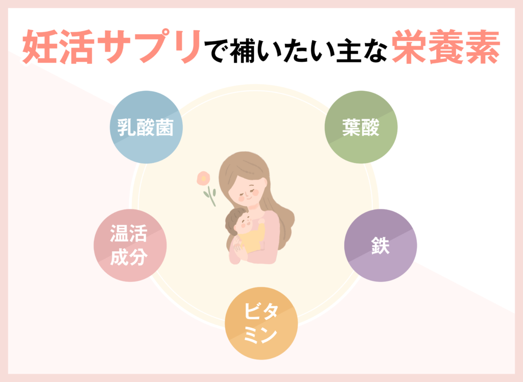 妊活中に摂取したい栄養は、葉酸だけではありません。鉄分やビタミン類、さらに冷え対策にアプローチする温活成分や、子宮内環境を整えるラクトバチルス菌など、多方面からサポートしてくれる成分を摂りたいところです。