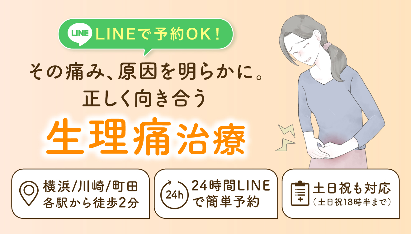 公式LINEまたはお電話にてご予約ください。WEB問診で、痛みの程度や始まった時期、月経周期などを事前にご入力いただくと、診察がスムーズです。