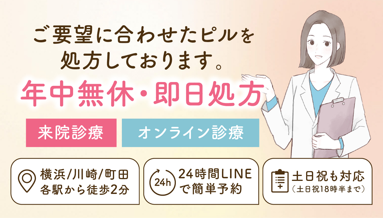 • ※低用量ピルの場合、治療目的での初回処方は検査が必要なため【来院診療】となります。ご不明な点はお気軽にお問い合わせください。